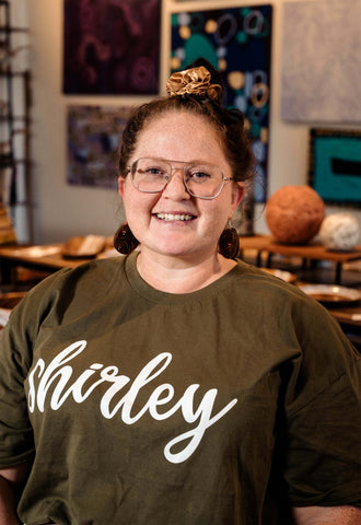 Casey Coolwell-Fisher is a Quandamooka woman of the Nunukul people from Minjerribah/Tjerrangerri (North Stradbroke Island). Casey has a creative background in graphic design and is the co-founder and artist, alongside her partner Roy Fisher, of CHABOO, a home decor and design business specialising in telling stories through graphic illustrations, hand-painted art and murals.