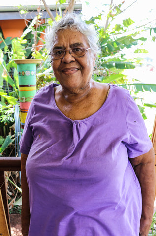 Dora is a significant elder of the Binthi clan (one of 32 clan lands of the Guugu Yimithirr tribal nations) and lives in Hopevale in Cape York QLD. Her family totems are Gaalaya (centipede) and Wandarr (white cockatoo). Dora’s mum’s family were from Stonehenge (near Winton QLD). After Dora’s Grandmother was bitten by a death adder, Dora’s mum and her siblings were taken to away to Cape Bedford mission.