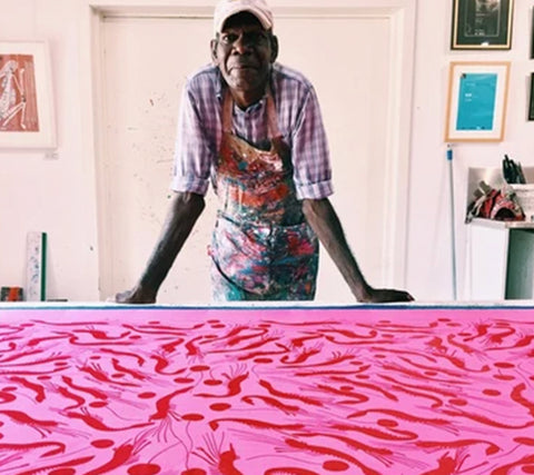 Reuben Manakgu (b. 1965) is a Bininj man of the Mandjuringunj clan. He is a printer and artist from Injalak Arts in Gunbalanya, West Arhnem Land. His language is Kunwinjku, and his country is Mangardubu. As Injalak’s screenprint production manager, Reuben is in charge of a small and dedicated team of Bininj men. His graceful character and artistic eye can be noted in his management skills, technical screenprint knowhow and talent for creating beautiful design colourways.