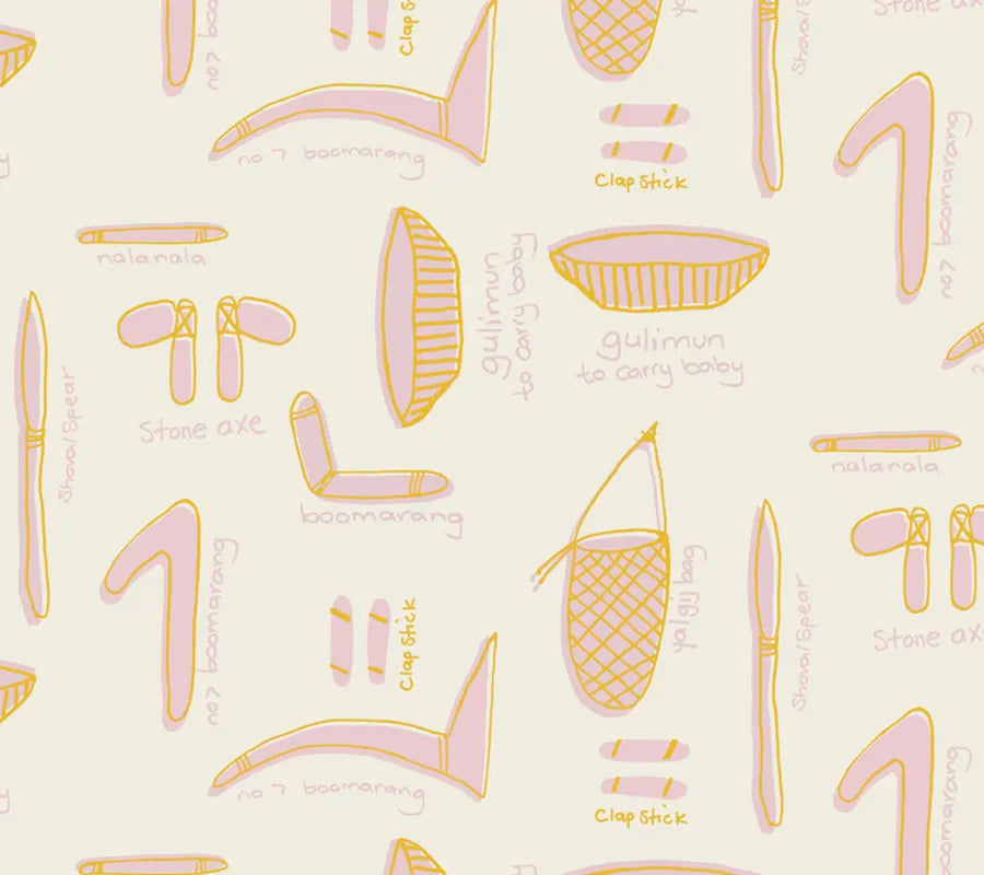 This collection teaches us about eating the stem of the lily pad just like celery (Yalbun + Jo jo); poisoning the water with a native tree to catch the most delicious fish around (Garrjala); the Goanna totem (Darbalun'); grinding the seeds of the lily pad to make flour, then patties (Yalbun); the traditional bush tools that Aboriginal people on Alawa country used to use to hunt, make babies strong, and carry bush food (Bush Tools); and the delicious crayfish that you can catch in the salty and fresh water rivers around Minyerri! (Dakawa’).